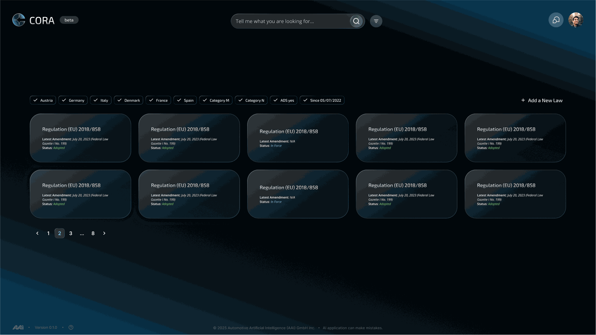 CORA ist eine KI-gestützte Plattform für regulatorische Intelligenz, entwickelt für Homologationsingenieur:innen, Compliance-Verantwortliche und Produktteams, die gesetzliche Vorgaben im Automotive-Sektor interpretieren, anwenden und nachweisen müssen.