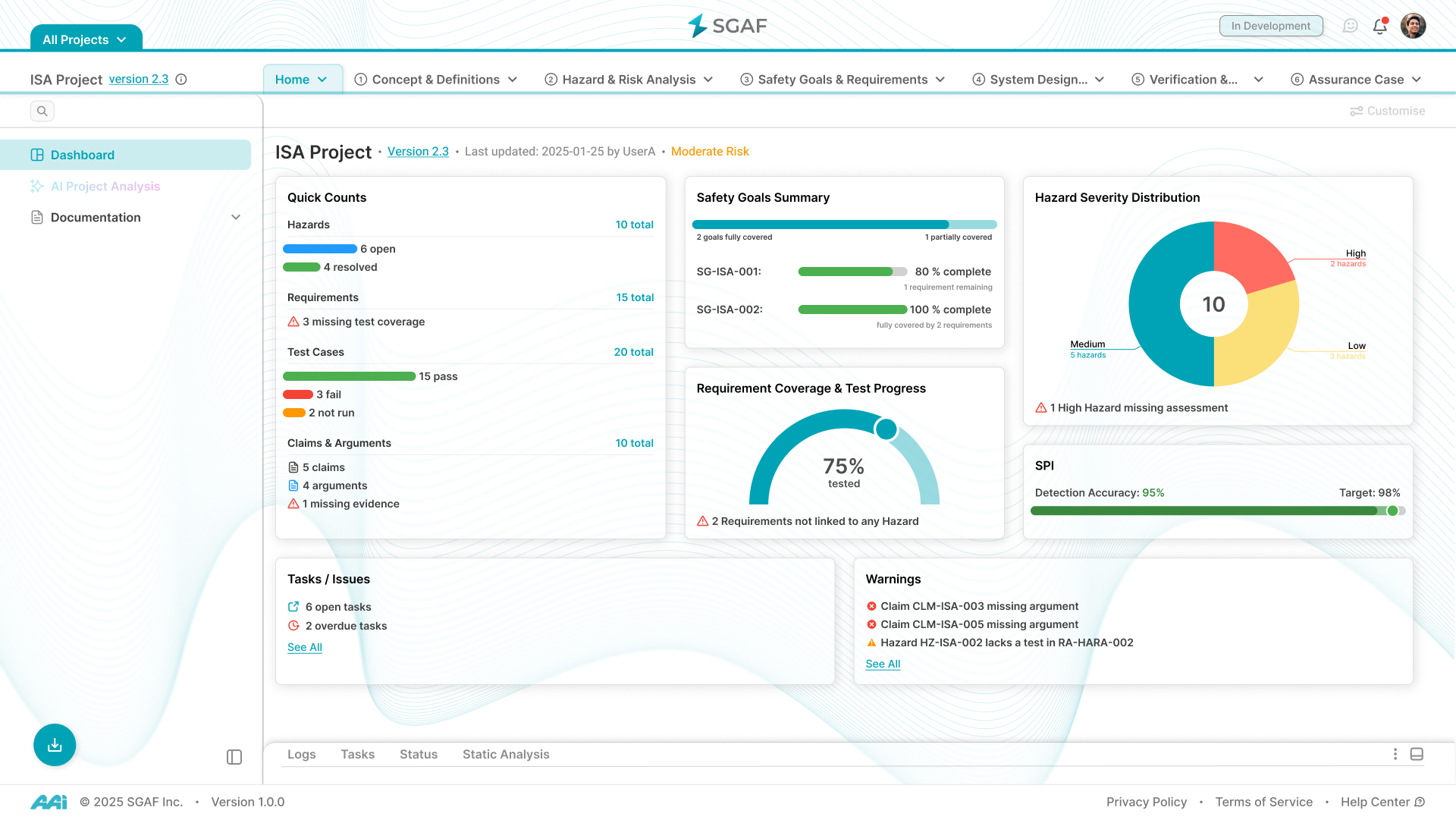 The Safety Guidance and Analytics Framework (SGAF) is a state-of-the-art solution for building, managing, and validating safety cases across the lifecycle of complex systems—particularly Autonomous Vehicles (AVs) and Autonomous Driving Systems (ADS).